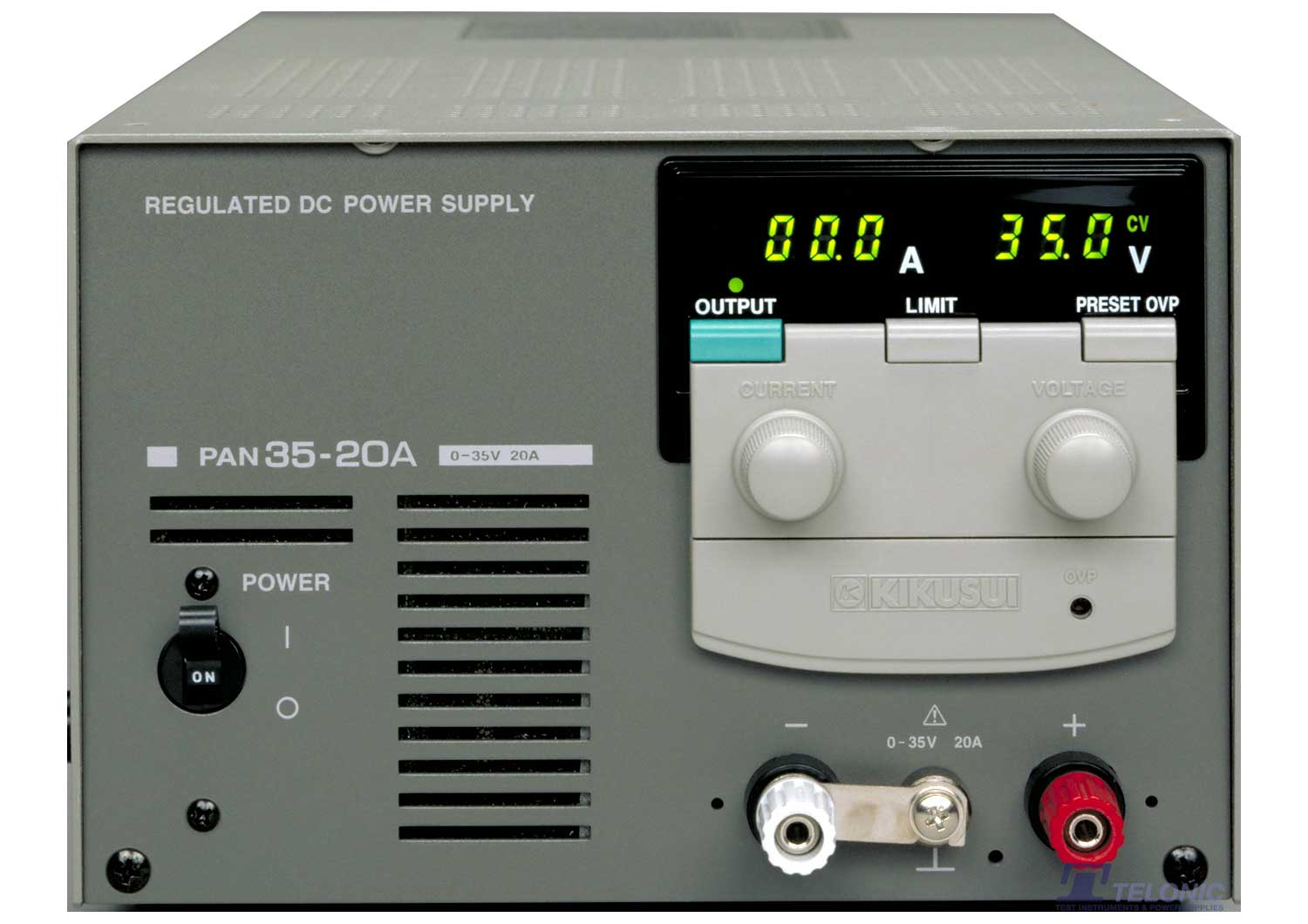 The PAN-A Series is a high-performance, highly reliable DC power supply unit featuring regulated variable voltage. These units are suitable for use in a range of fields including research and development, quality control, and production. The PAN-A Series consists of a pre-regulator using FETs and a Series regulator using power transistors, providing the high-quality output characteristic of the latter as well as the low power-source harmonic distortion of choke input type phase control. To achieve the high reliability and safety, components of sufficient derating and long-proven mounting techniques are used throughout. All models are carefully designed and furnished with over voltage protection (OVP) and various safety functions.