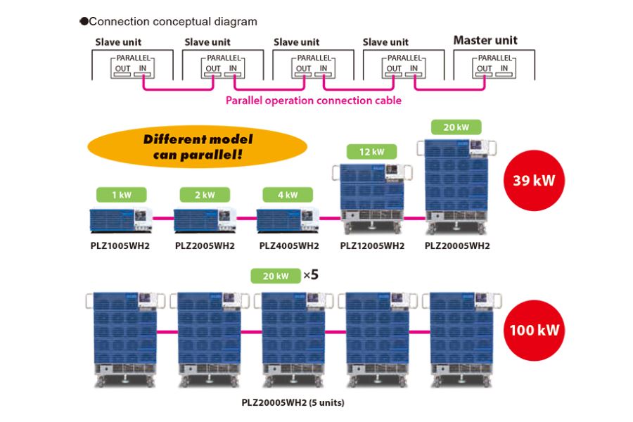 The Kikusui PLZ12005WH2 (10V-1000V 0-240A 12kW) High Voltage DC Electronic Load (CC/CR/CV/CP/ARB) forms part of the new Kikusui PLZ-5WH2 series where durable, reliable ingenuity meets multifunctional high power design. Providing a choice of five power range line-ups, from 1 kW bench top style model to a high power floor standing model that can sink up to 20 kW of power in a single unit, now making it easy to select the correct power electronic load to test your EUT at full power. Load simulation can be achieved faster than ever before thanks to the reliable, high speed design of the PLZ-5WH current control circuits. Accurate current measurements can be made with the electronic loads extremely high setting resolution. A colour LCD display allows user-friendly front panel operation.