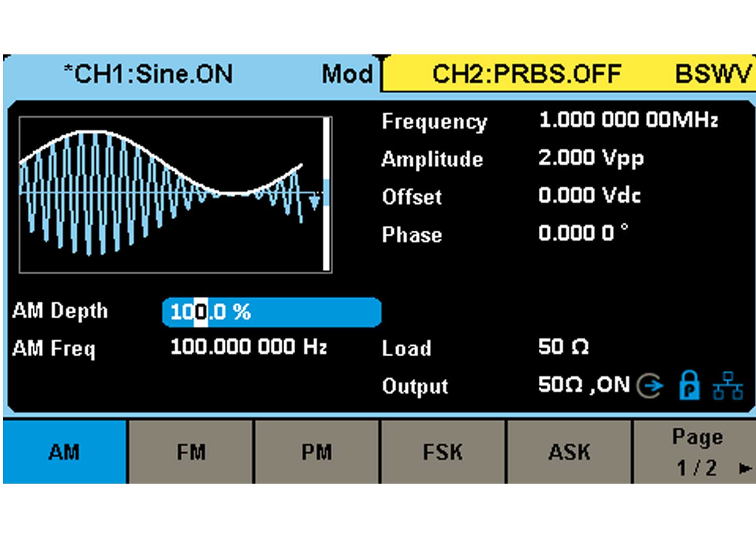 - Plenty of analog and digital modulation types: AM, DSB-AM, FM, PM, FSK, ASK, PSK and PWM