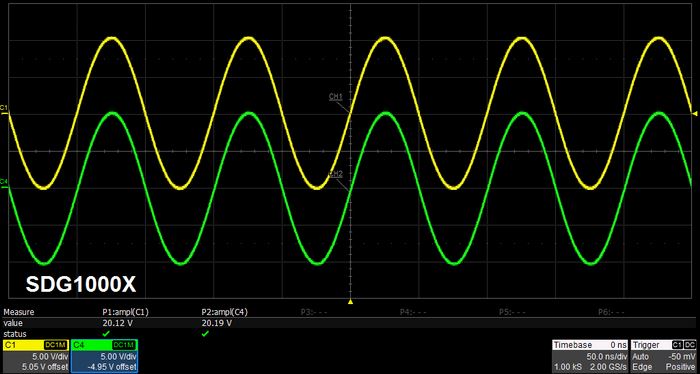 Dual channels, Sine, 1kHz, 10Vpp, 50Ξ© load |