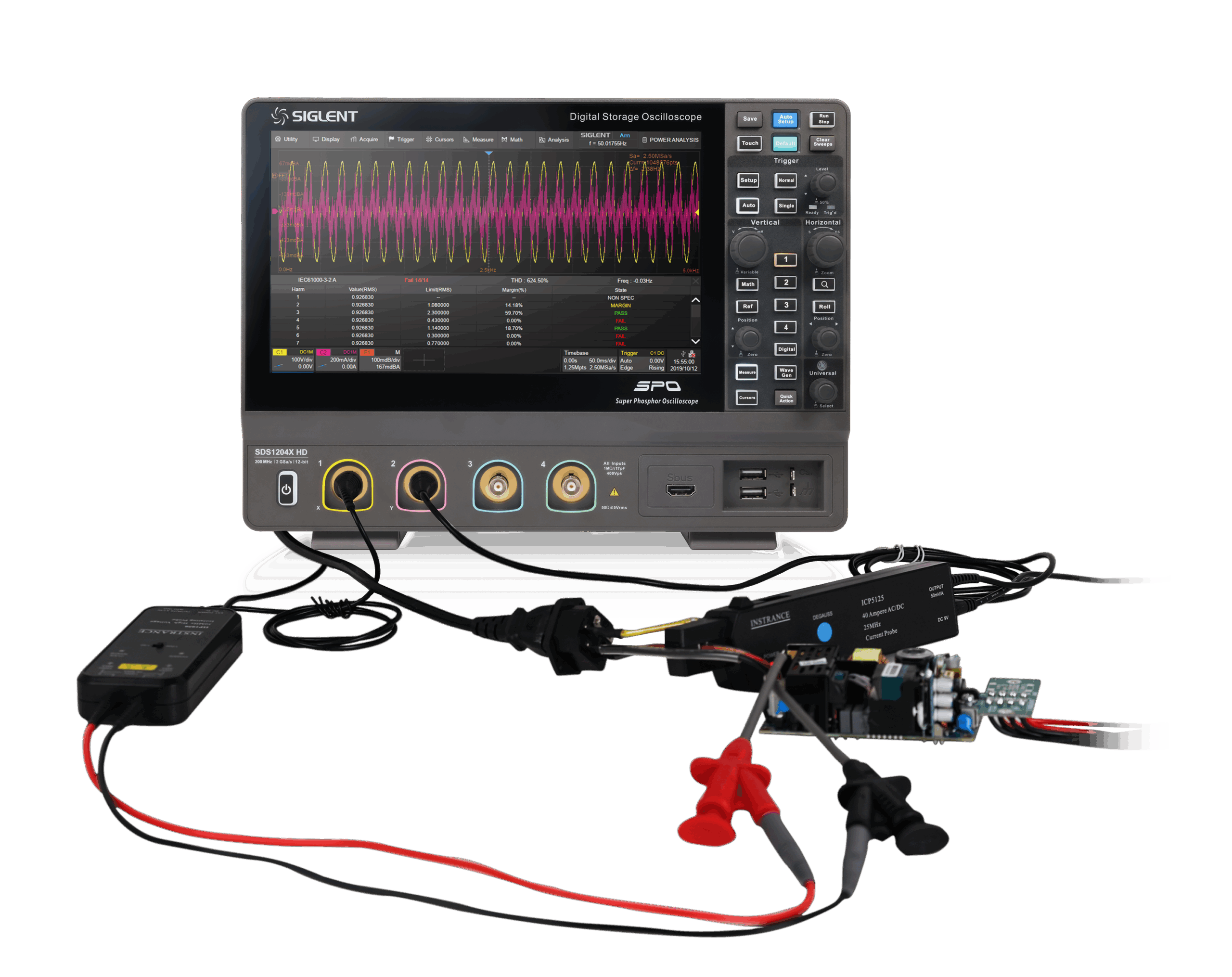 SDS1102X HD 100MHz, 2 channels, 2GSa/s, 12-bit high resolution, 100Mpts memory depth mixed signal oscilloscope; 12.1” touch screen