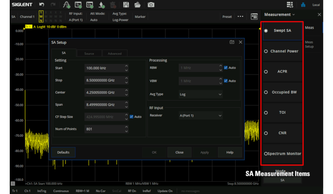 The SNA6000A series excels in measuring Q-factor, bandwidth, and insertion loss of filters, while also offering features such as impedance conversion, fixture simulation, limit testing, and ripple tests. Its five sweep modesβLinear-Frequency, Log-Frequency, Power-Sweep, CW-Time, and Segment-Sweepβprovide users with flexible measurement options.