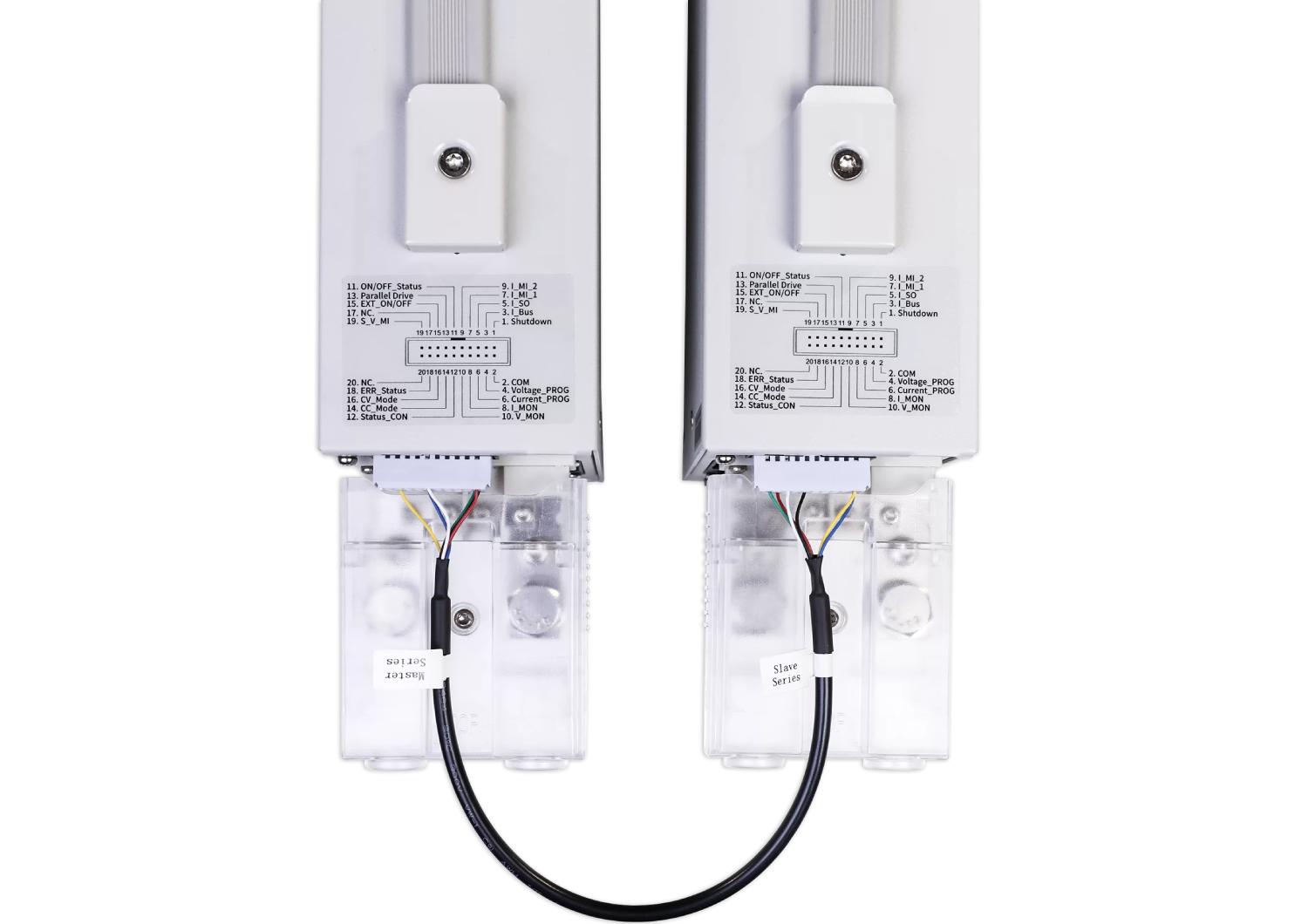 Connection cable for the SPS5000X series DC power supplies, enabling multiple units to connect in series to achieve higher voltage outputs (e.g., up to 320V) or in parallel for higher current, with a maximum combined power of 3240W