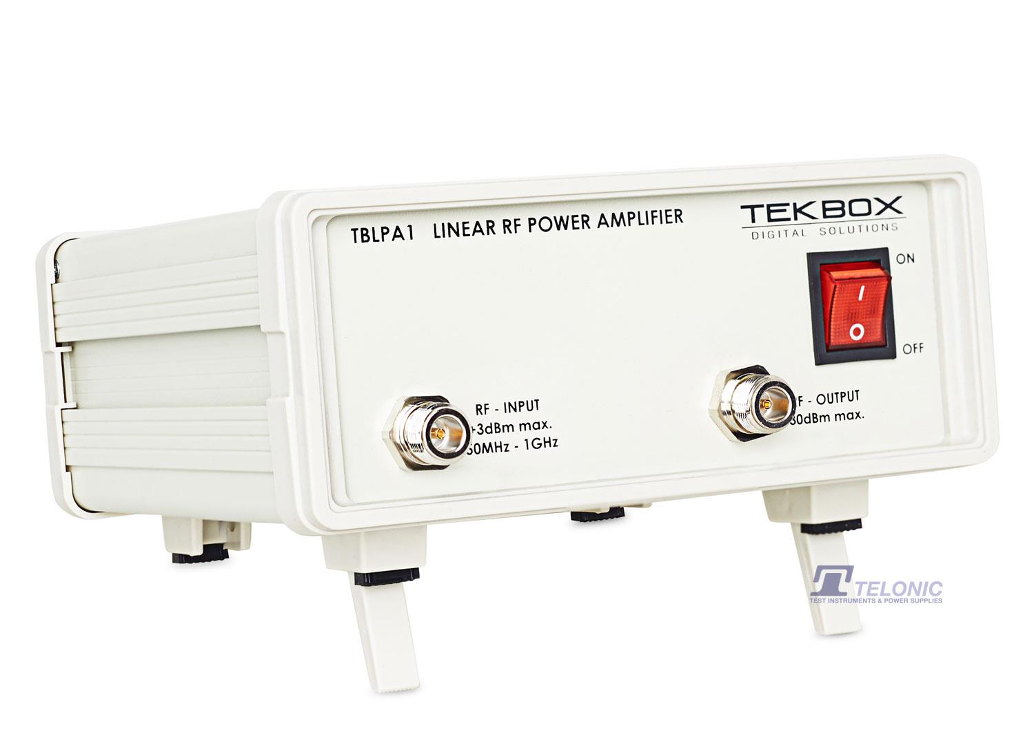 The TBLPA1 linear wideband power amplifier is a general purpose RF amplifier for test and measurement applications. It has an output power capability of up to 1W and can be used in the frequency range from 10MHz to 1GHz and with reduced output power capability even beyond.