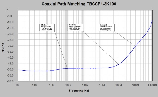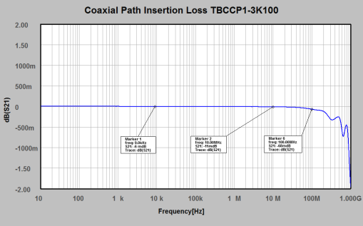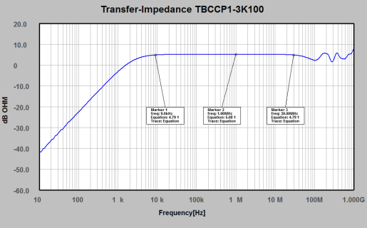 The probe has a 3 dB bandwidth from 3 kHz to 100 MHz and a very flat response from 9 kHz to 30 MHz. The transimpedance is characterized over the frequency range from 10 Hz to 100 MHz. The TBCCP1-3K100 is primarily designed as transducer for active loop antennas or for measurement of RF currents in coaxial cables.