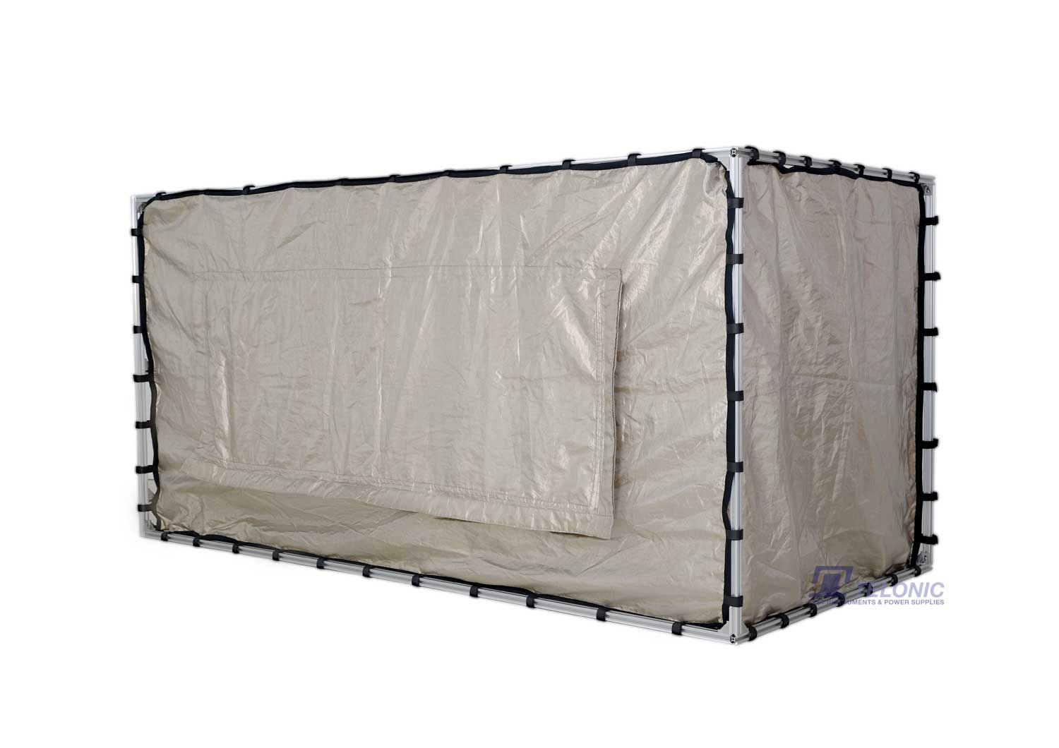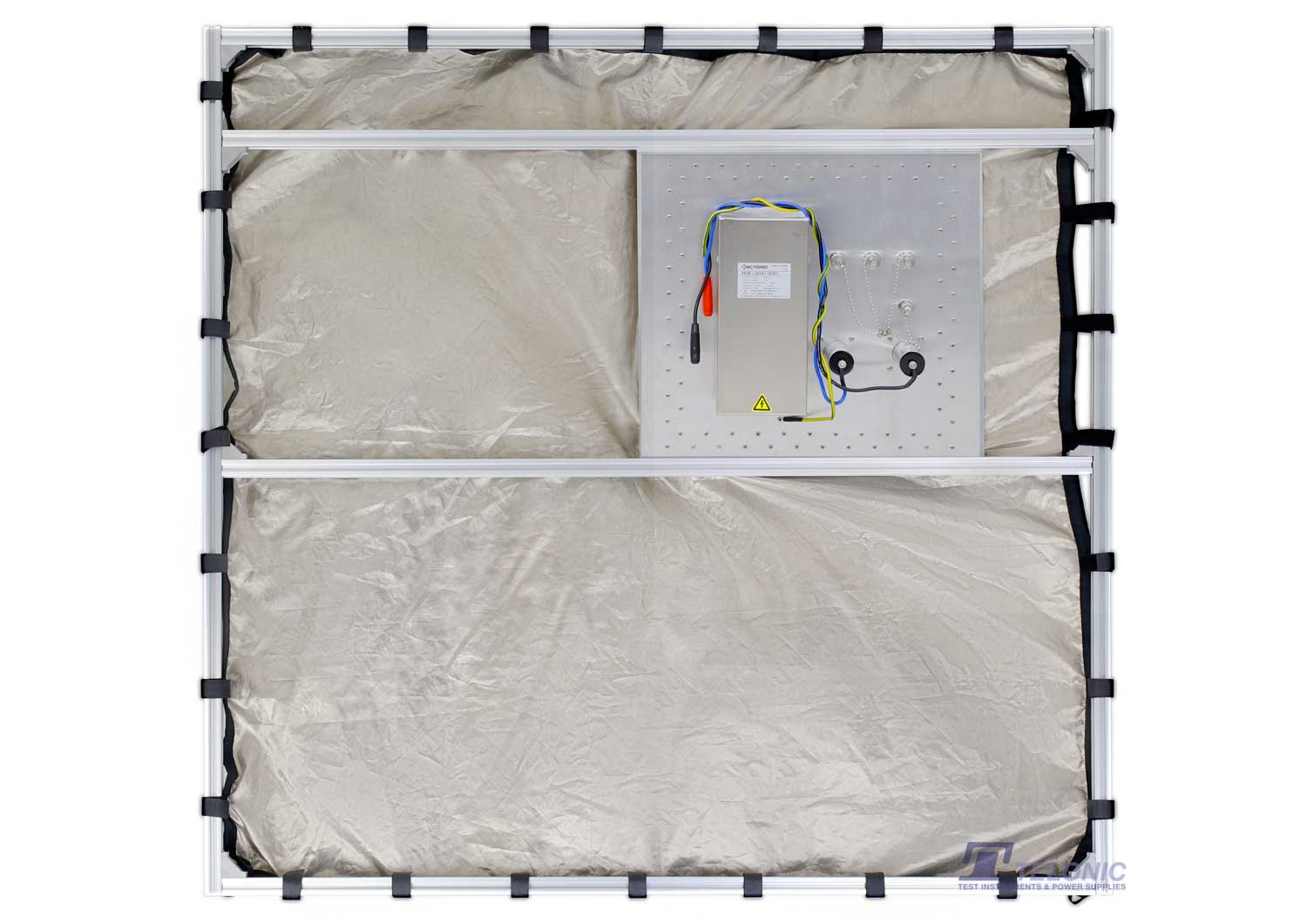 The shielded tents are composed of two layers of conductive fabrics. It is supported by rigid aluminium profiles. The filter panel at the side provides a 240V/10A mains AC filter (optional for the smaller tent), two general purpose 240V/10A AC/DC filters and four coaxial feed through adapters with screw caps. The access opening is sealed with conductive Velcro tape.